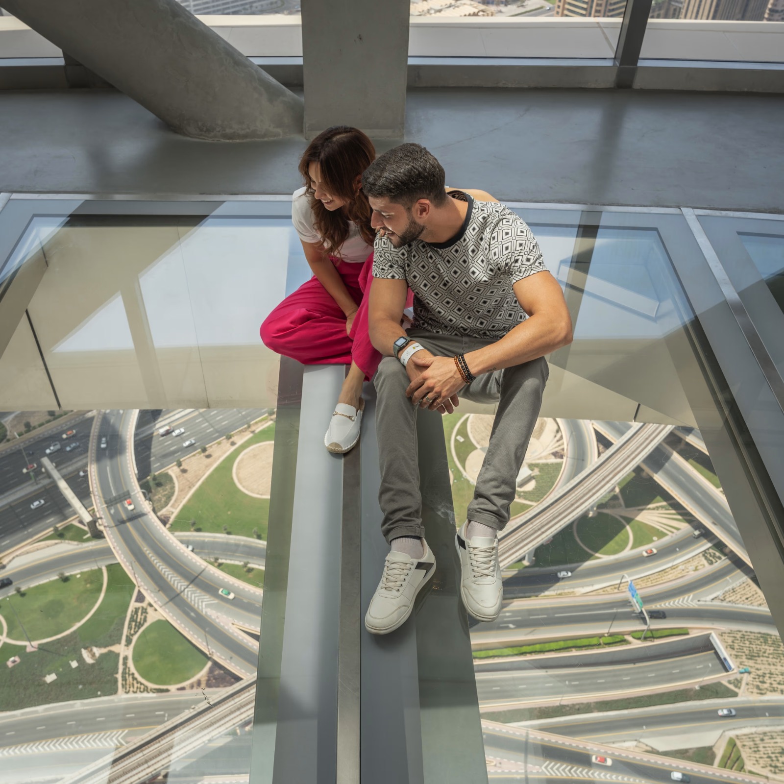 At 219.5 meters above Dubai, the Sky Views observatory features a stunning 25m-long glass floor at the cantilevered enjoying exceptional views of the Burj Khalifa, the city, visitors can also admire through a panoramic elevator with glass on 3 sides, and the Panorama 52 restaurant.
